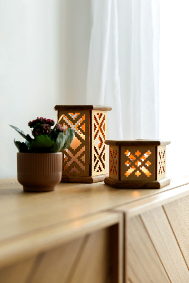 Valmistatud tammepuust ja kõrgema klassi kasevineerist, hoolikalt lihvitud ja viimistletud naturaalse puiduõliga, et tuua välja materjali loomulik ilu. Pakume ka viimistlemata varianti neile, kes austavad puhast puitu või soovivad ise värvida oma sisustusega sobivasse tooni. Iga latern on hoolega üle vaadatud ja käsitsi kokku pandud. Valmistatud Eestis ja kohalikult hangitud materjalidest. Teadagi on nii Tamm kui Kask Eestile pärismaised lehtpuud ja on kõrgelt hinnatud mööbli, põrandate ja muude esemete valmistamisel. See tagab stabiilse ja vastupidava toote, mis pakub nii silmailu kui funktsionaalsust.