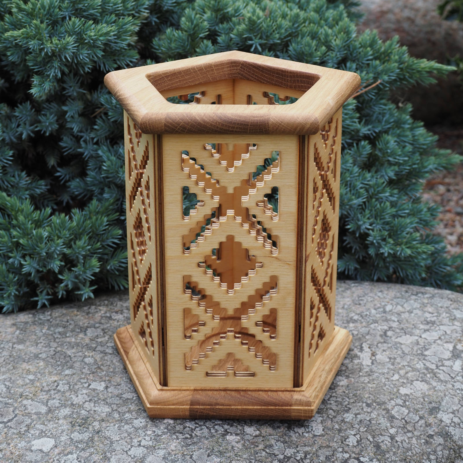 Latern on valmistatud looduslikust puidust ja inspireeritud Seto mustritest. Sobib suurepäraselt sooja ja kutsuva atmosfääri loomiseks nii sees kui väljas, pakkudes omapärast valgustuslahendust.